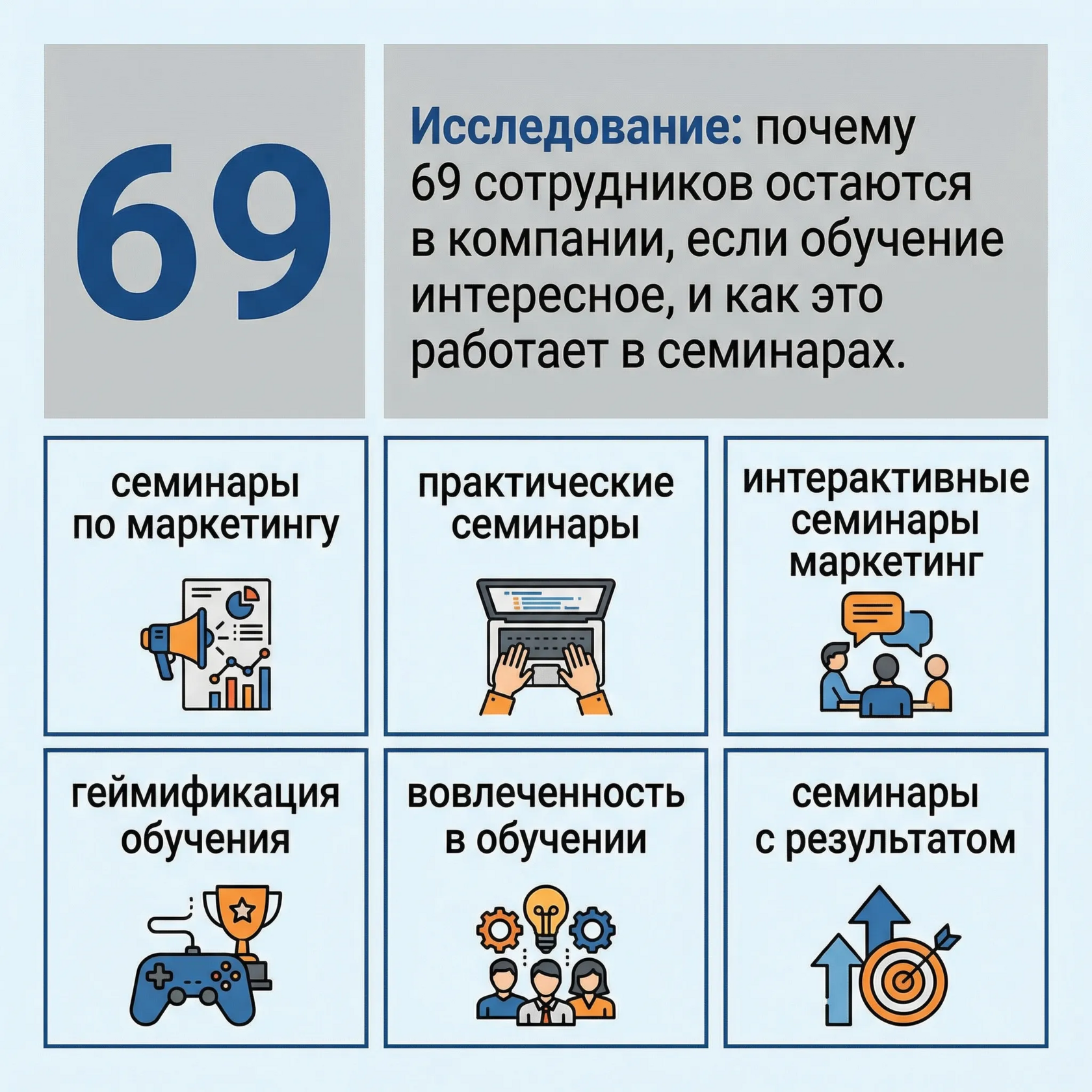 Корпоративное образование перестало быть формальностью — теперь это мощный инструмент управления персоналом. Компании, инвестирующие в развитие своих сотрудников посредством интересных и полезных семинаров, получают долгосрочную выгоду в виде стабильного коллектива и повышения общей производительности труда. Инвестируя в обучение, вы инвестируете в будущее своего бизнеса!