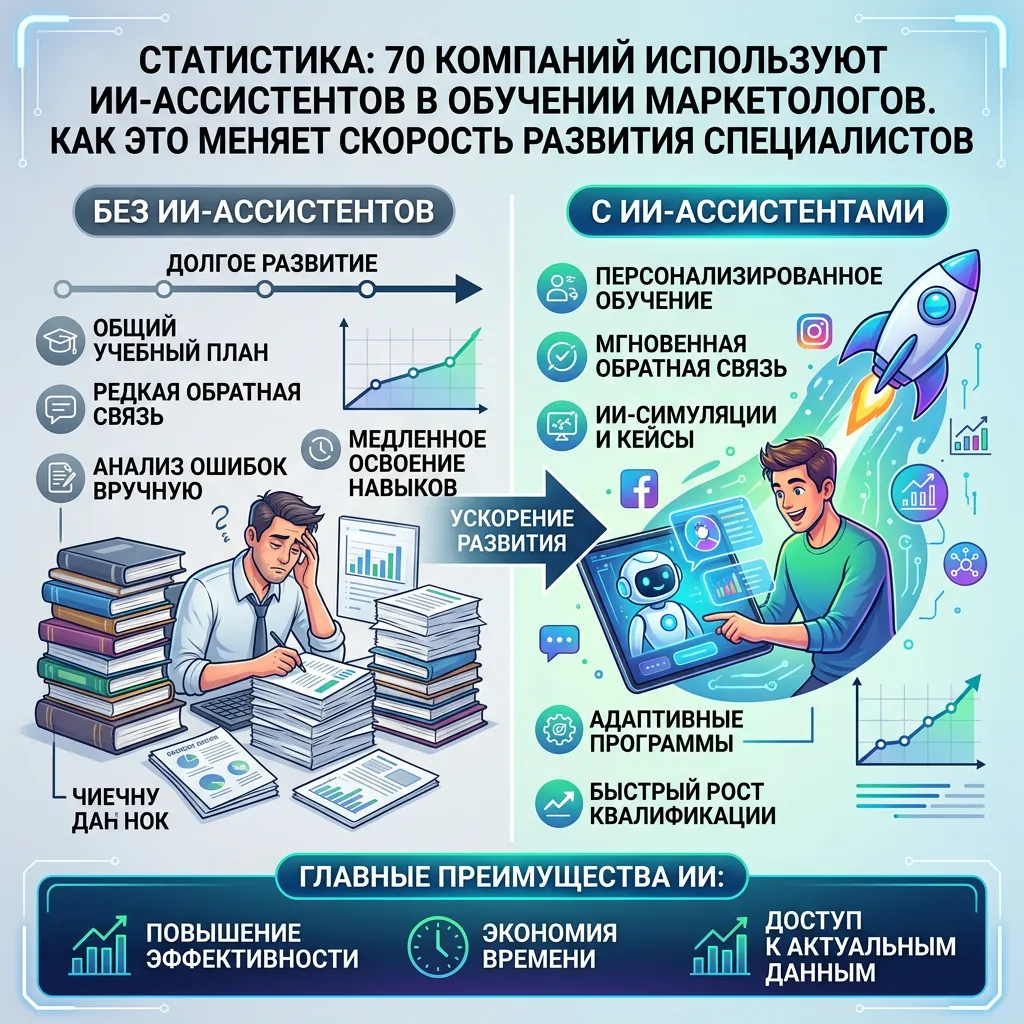Согласно последним данным, 70% компаний уже активно применяют ИИ-ассистентов в процессе обучения сотрудников-маркетологов. Эта цифра наглядно демонстрирует стремительное проникновение технологий искусственного интеллекта в сферу профессионального образования и повышения квалификации специалистов.
